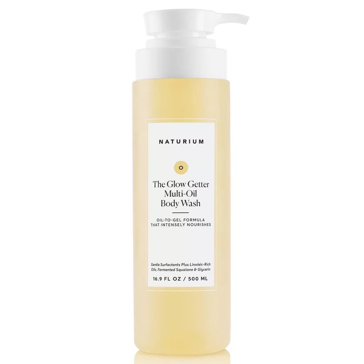 Naturium The Glow Getter Multi-Oil Hydrating Body Wash is a luxurious, sensorial cleanser that transforms from a rich oil into a gentle, creamy lather. Formulated with over 50% glycerin, plant-based squalane, and linoleic-rich oils, it intensely hydrates, nourishes, and supports the skin barrier without stripping essential moisture, leaving skin glowing.